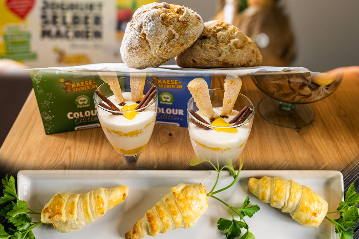 - Nun die Joghurt-Quark-Masse und das Mangopüree abwechselnd in einem Glas schichten und die Biskuits als Ohren rein stecken. Rosinen als Augen und Mikadostäbchen als Tasthaare hinzufügen und fertig sind die kleinen Hasen im Glas.