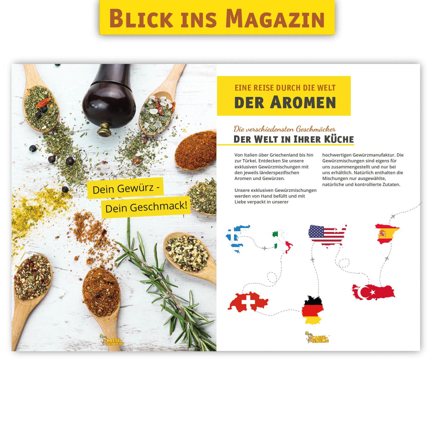 10 verschiedene und exklusive Gewürzmischungen zum ausprobieren inkl. Rezeptmagazin "Unsere Gewürzwelt" mit vielen leckeren Rezepten, passend zu unseren Gewürzen.