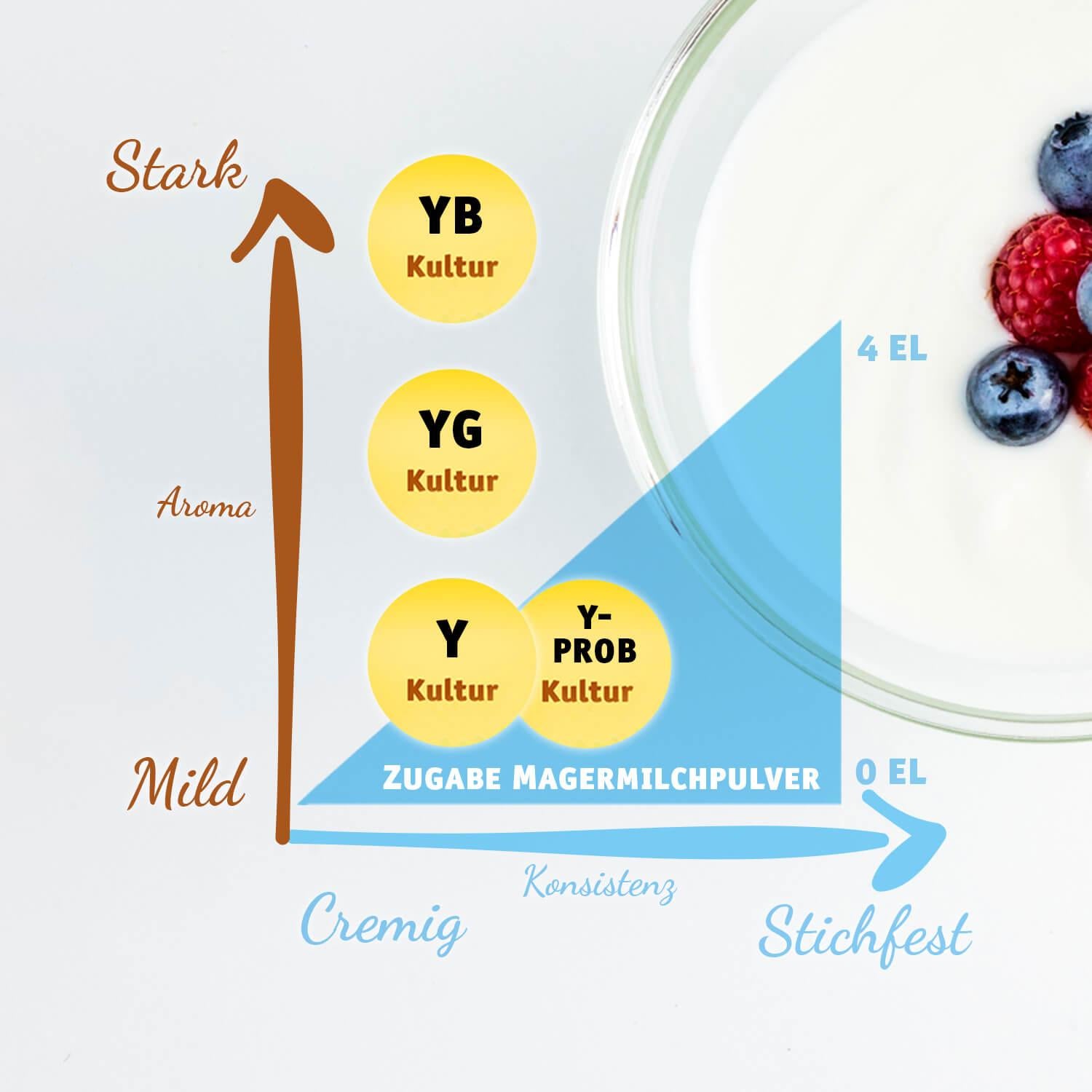 Sie können das Joghurt Set wahlweise mit einem Beutel Y Joghurtkultur, YB Joghurtkultur, Y-PROB Joghurtkultur oder YG Joghurtkultur griechische Art bestellen.