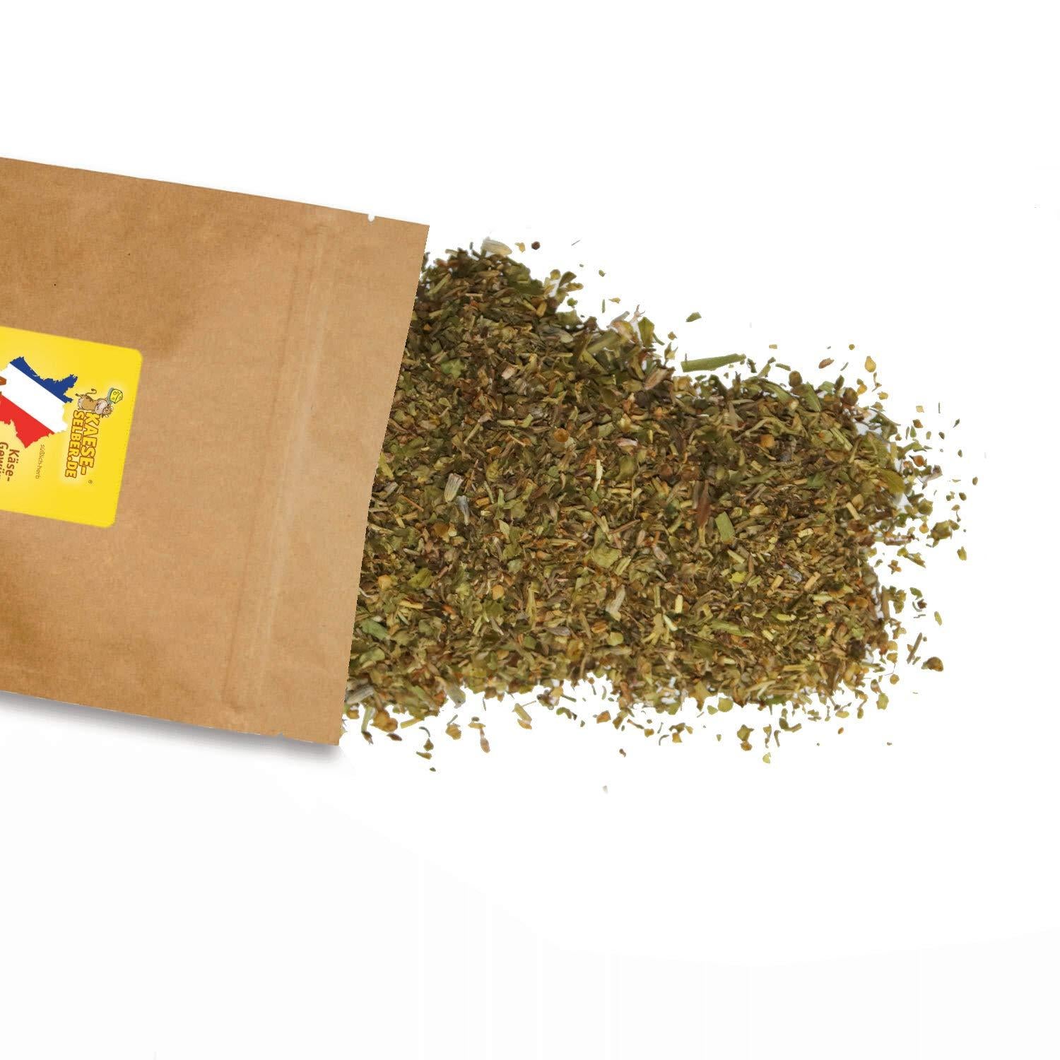 Die Kräutermischung enthält Thymian, Rosmarin, Bohnenkraut, Majoran, Oregano, Salbei, Petersilie, Estragon und Lavendelblüten.
