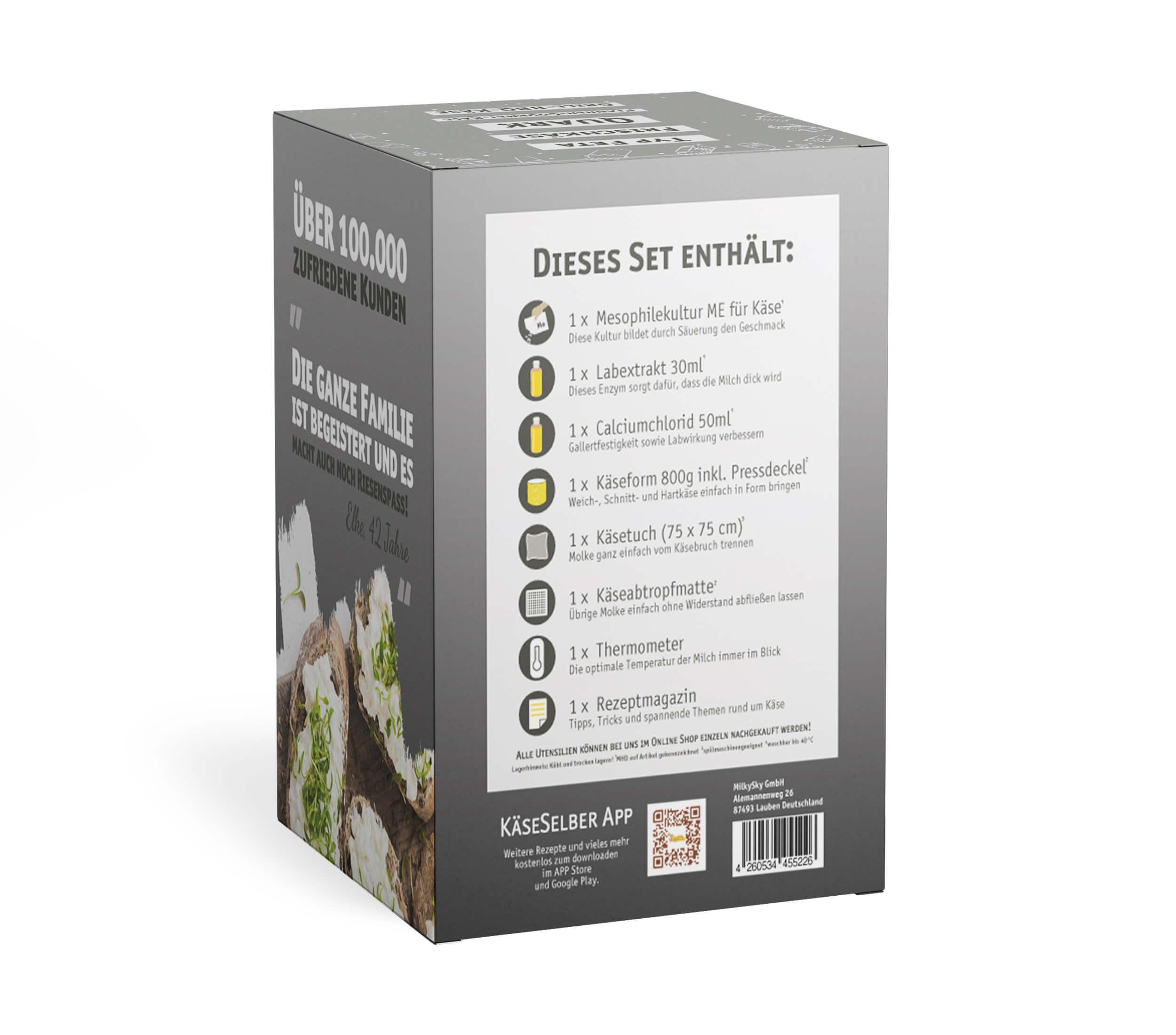 Lieferumfang:1x Mesophilekultur ME für Käse in luftdichter Verpackung, 1x Grußkarte, 1x eine Flasche Labextrakt flüssig 30ml (nach Wahl), 1x eine Flasche Calciumchlorid flüssig 50 ml - 35 %ige Lösung, 1x Käseform Ø 120 mm mit 1x Pressdeckel Ø 118 mm, 1x Käsetuch (Quarktuch) 75 cm x 75 cm, 1x Käseabtropfmatte fein 25 cm x 23 cm, 1x Thermometer 0 - 100 °C, 1x Rezeptmagazin 52 Seiten (DIN A5 Format / Schritt für Schritt Anleitungen und mehr).