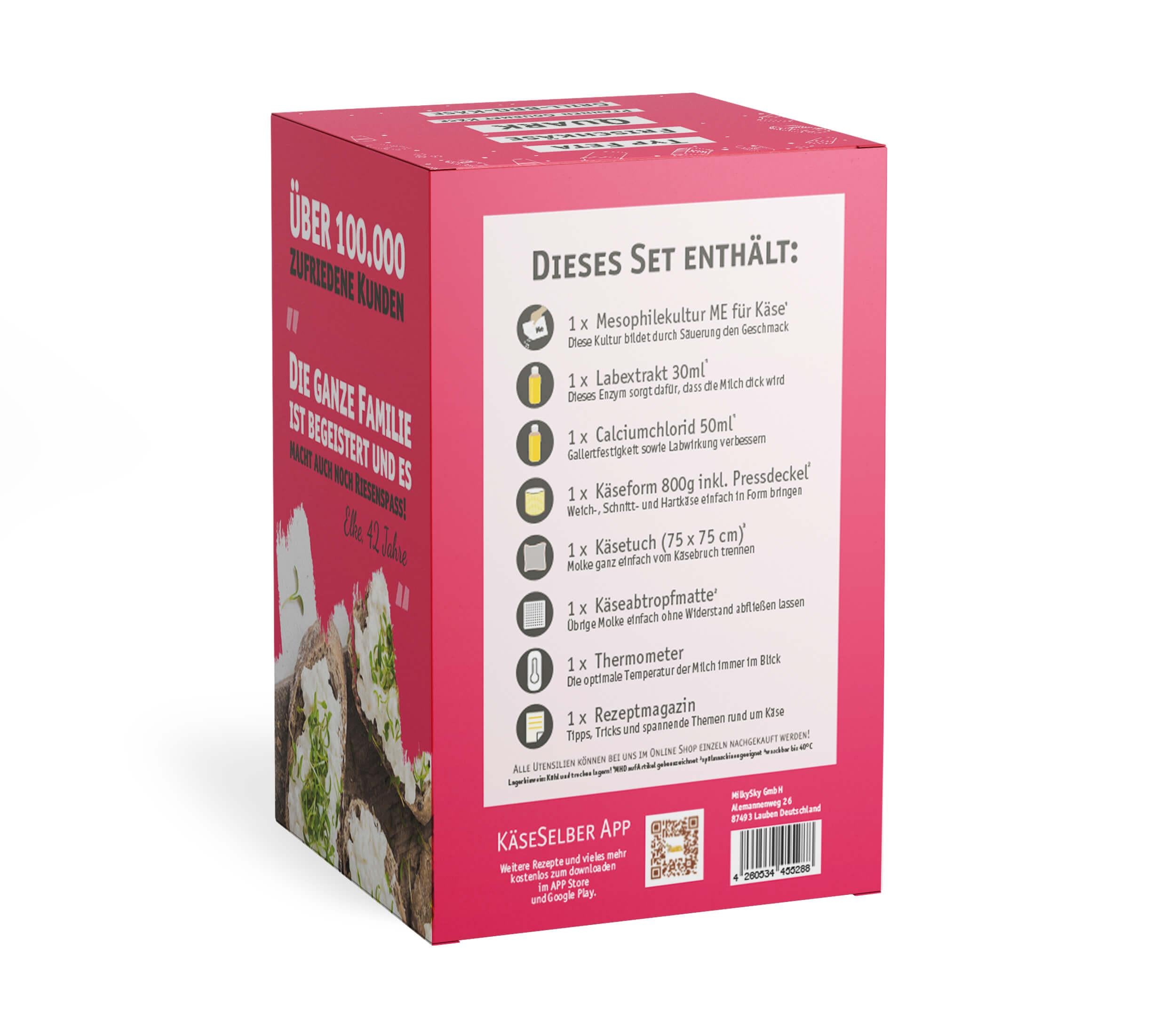 Lieferumfang:1x Mesophilekultur ME für Käse in luftdichter Verpackung, 1x Grußkarte, 1x eine Flasche Labextrakt flüssig 30ml (nach Wahl), 1x eine Flasche Calciumchlorid flüssig 50 ml - 35 %ige Lösung, 1x Käseform Ø 120 mm mit 1x Pressdeckel Ø 118 mm, 1x Käsetuch (Quarktuch) 75 cm x 75 cm, 1x Käseabtropfmatte fein 25 cm x 23 cm, 1x Thermometer 0 - 100 °C, 1x Rezeptmagazin 52 Seiten (DIN A5 Format / Schritt für Schritt Anleitungen und mehr).