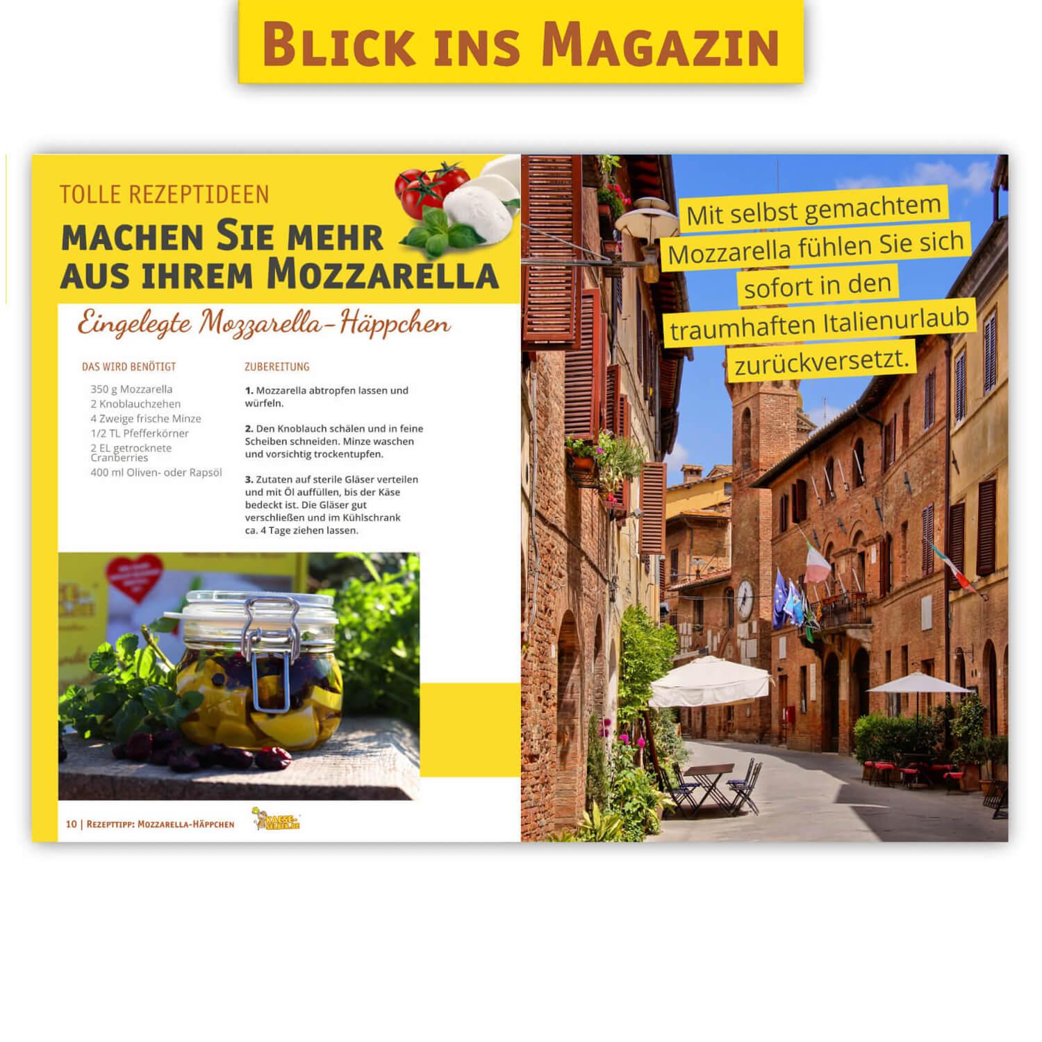 16 Seiten im A5 Format voll gepackt mit Schritt für Schritt Anleitungen für Mozzarella und Ricotta, Wissenswertes über die verschiedenen Milchsorten, bildlichen Erklärungen, tollen Rezeptideen und Anregungen.