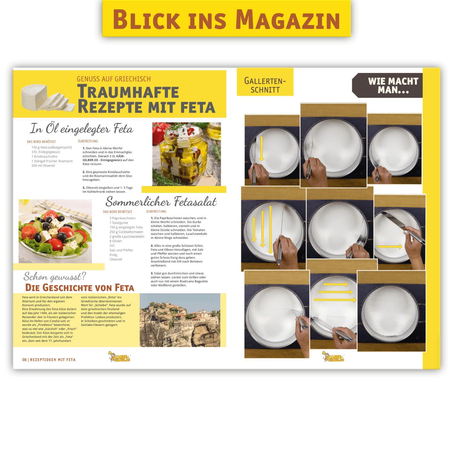 Das Rezeptmagazin im DIN A5 Format ist wie ein Baukastensystem aufgebaut. Die Grundlage bildet unser Starter-Set, welches Sie nutzen können um verschiedene Käsesorten herzustellen. Zusätzlich finden Sie oberhalb jedes einzelnen Rezepts eine Schnellübersicht, die Ihnen zeigt, welche Utensilien Sie für die Herstellung des jeweiligen Käses benötigen. So müssen Sie nicht erst das komplette Rezept durchlesen, wie es noch bei unserer alten Rezeptmappe der Fall war.