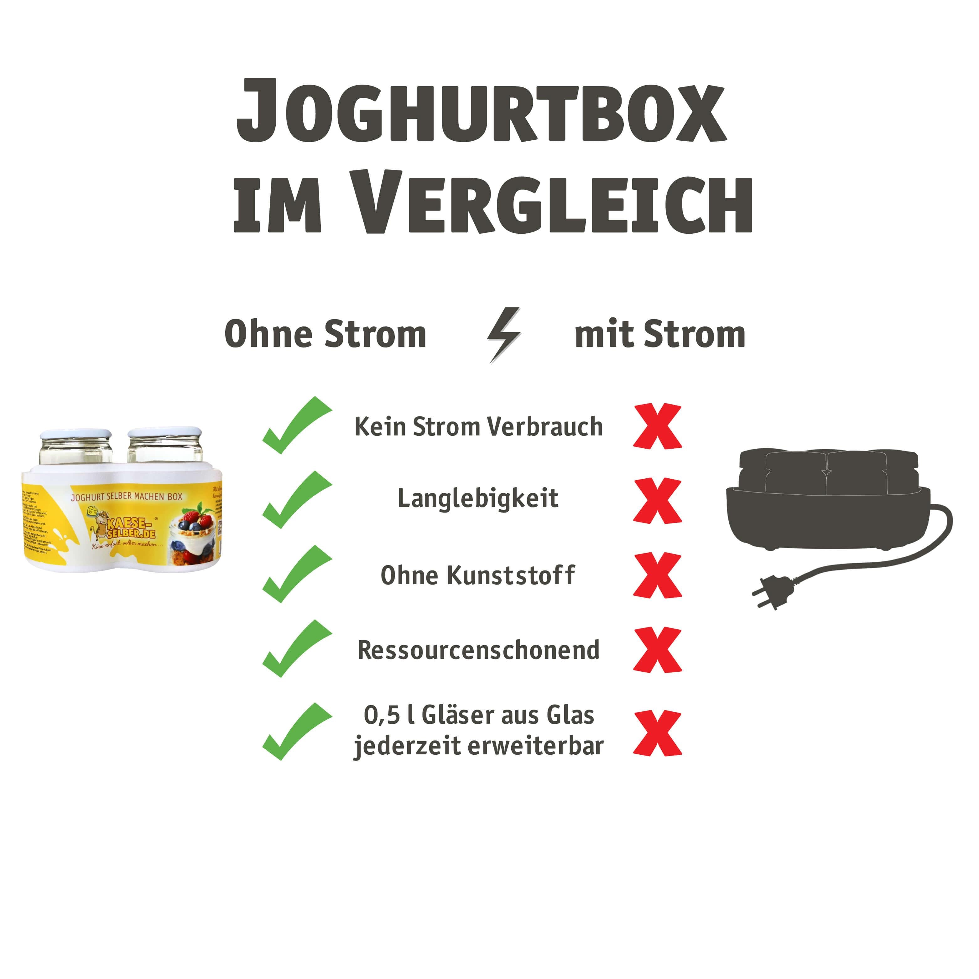 Die Joghurt Box für sorgt für eine optimale Reifungstemperatur. Die Box beinhaltet zudem 2 Joghurtgläser (0,5 Liter) sowie eine Schritt für Schritt Anleitung.