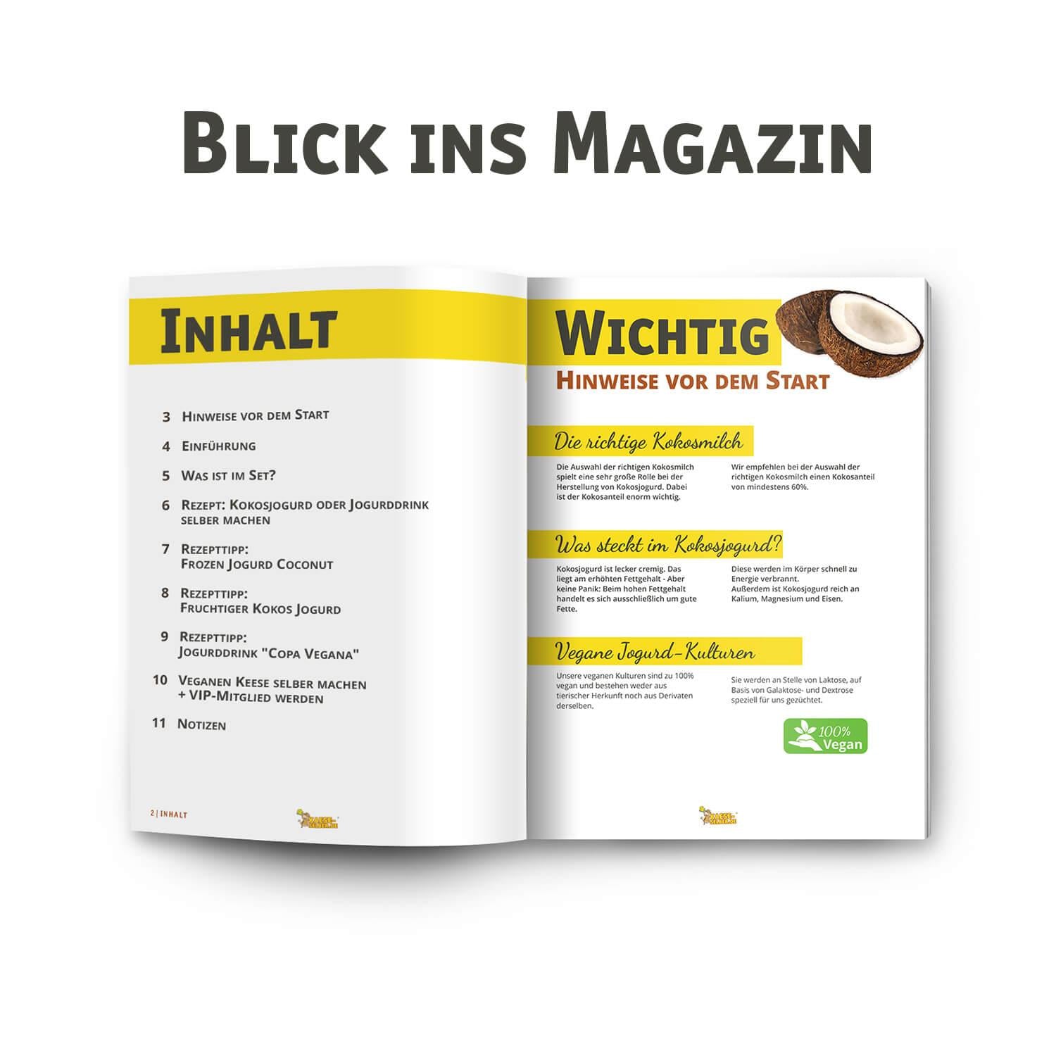 Mit diesem Rezeptmagazin im hochwertigen und edlen Design, können Sie ganz einfach Ihren Kokosjogurd selber machen! 12 Seiten im A5 Format voll gepackt mit Schritt für Schritt Anleitungen und tollen Rezeptideen, sowie Wissenswertes rund um das Thema Kokosjogurd, Drink und vieles mehr.